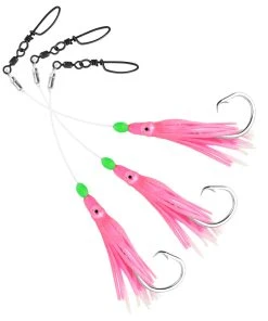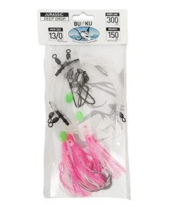 Dressed with 3.5″ pink or lumo green plastic octopus skirts and luminescent beads the Buku Jurassic Deep Drop rig will maximise bites due to its visibility at great depths. If you are to ever lose a branch of the rig replacement branches are also available and simply clip straight onto your existing rig.