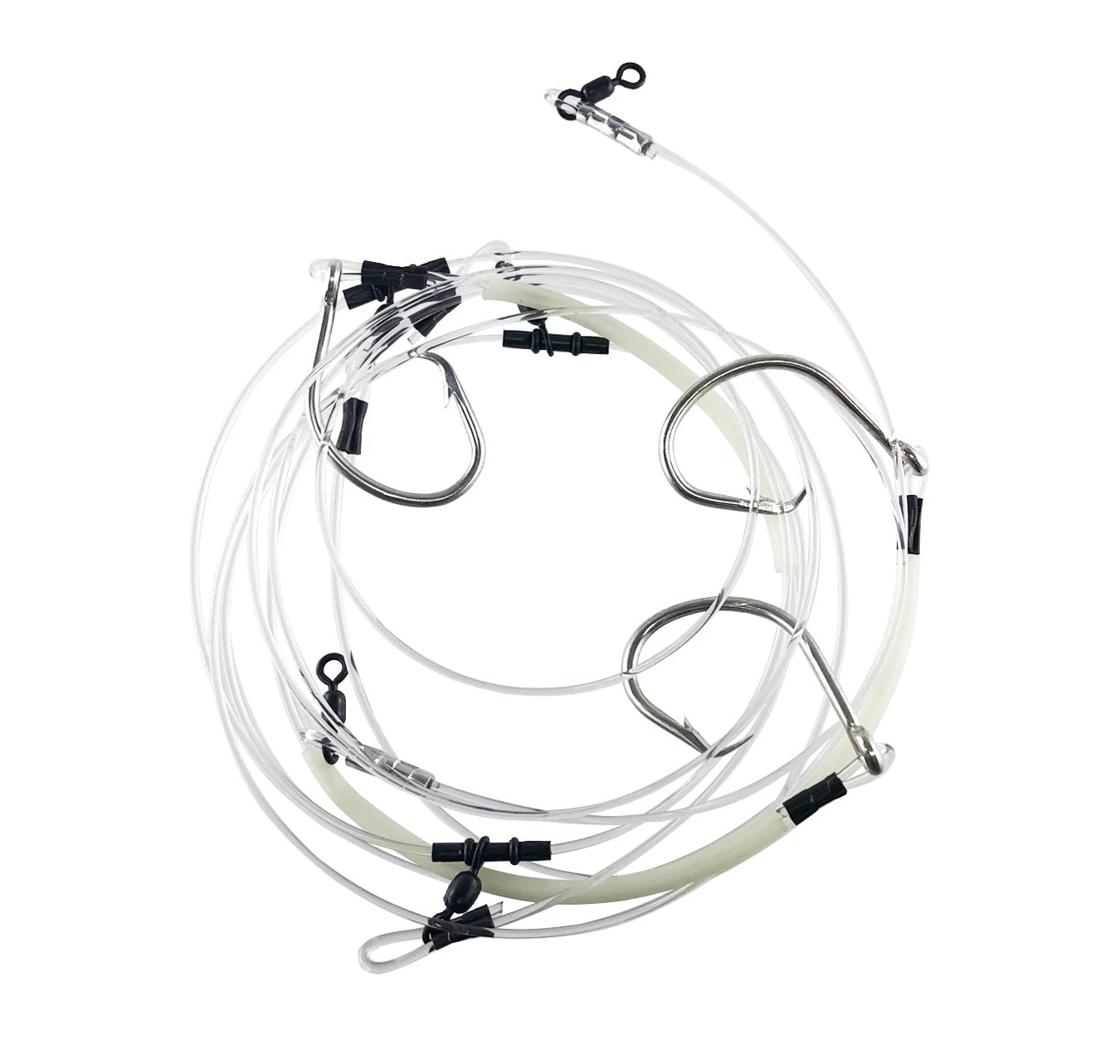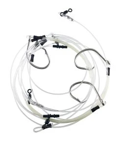 The perfect deep drop rig with three hooks equally set apart, and an extra swivel down the bottom to attach the weight to.