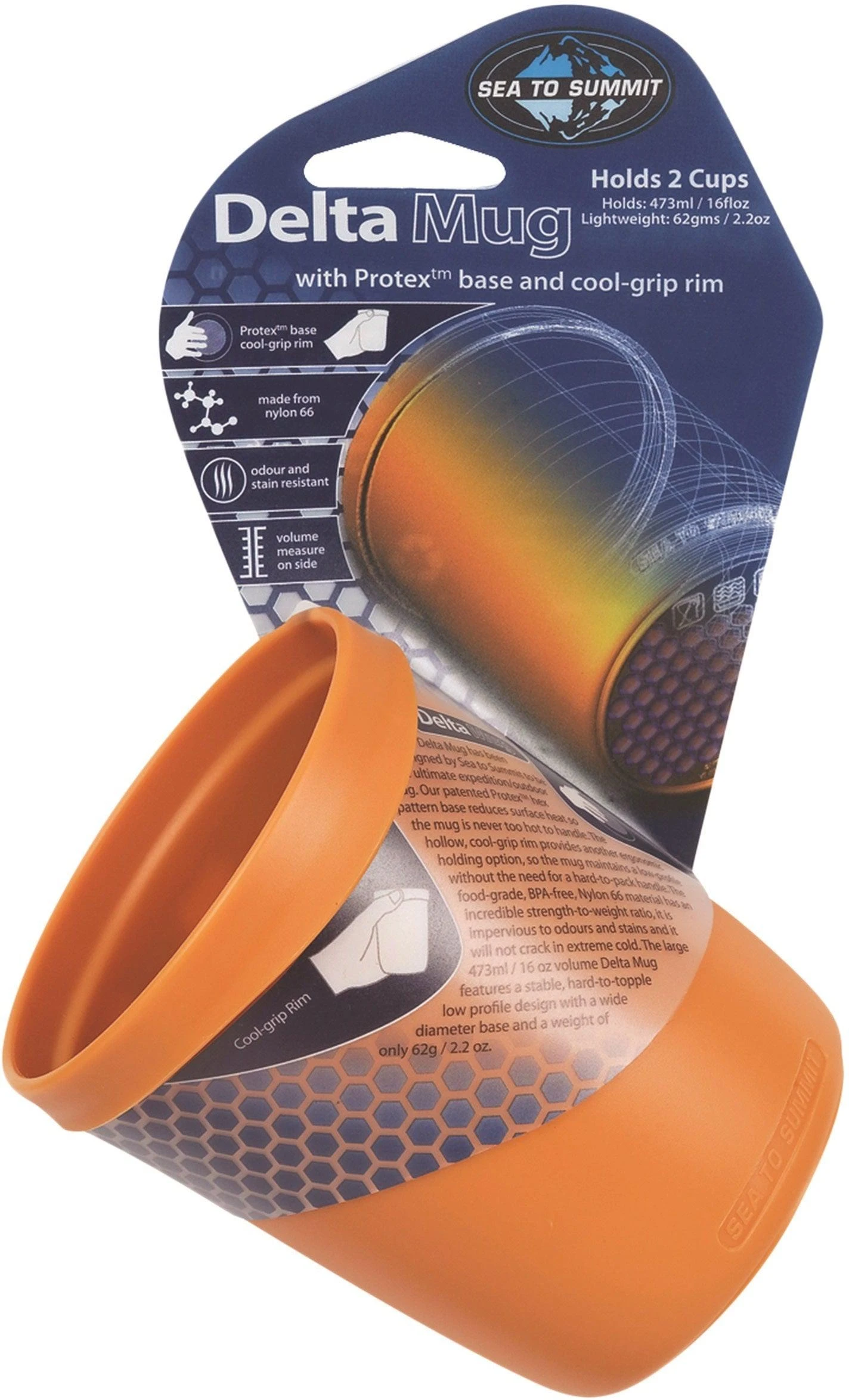 The Delta Mug has been designed by Sea to Summit to be the ultimate expedition and/or outdoor mug. Our patented Protexâ„¢ hex pattern base dissipates heat and reduces the weight to only 62g. The ergonomic rim is heat resistant and comfortable to hold even with hot liquids, meaning a hard to pack handle is not necessary. The food grade, BPA free, Nylon 66 material has an incredible strength to weight ratio, it is resistant to odours and stains and it will not crack in the extreme cold. The large 473mL volume Delta Mug features a stable, low profile hard to topple design with a wide diameter base.
