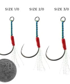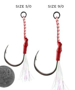 The 5/0 and 9/0 sized hooks come in packs of 2 assist hooks and are much heavier gauge hooks suited for bigger and harder fighting species like big tuna.