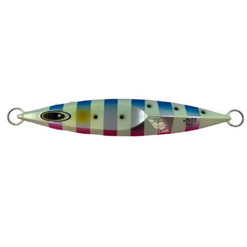 The Vexed “Reverse Drop In” has been specifically designed to be fished slow and deep with the assistance of a Twin Assist Rubber Squid. This will greatly improve visibility and you will achieve more solid internal jaw hook up’s. The “Reverse Drop In” is the perfect choice for deep water species including blue eye trevalla, cod, bass groper, hapuka and ruby snapper. This jig can also be mechanically fished for species such as tuna, kingfish, samson fish, dog tooth, amberjack and GT.